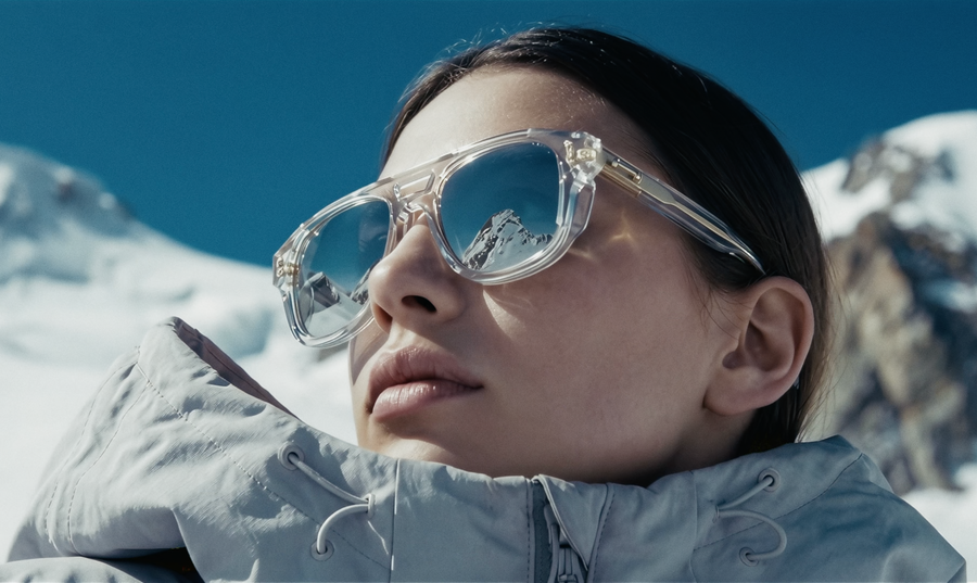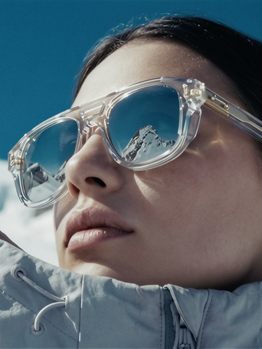 Crystal clear acetate structures meet bold proportions and expressive lenses, while the color palette draws from ice, snow, and reflected light, combining AKONI’s signature green with mirror blue and mirror green mustard tones to evoke a contemporary alpine aesthetic.
